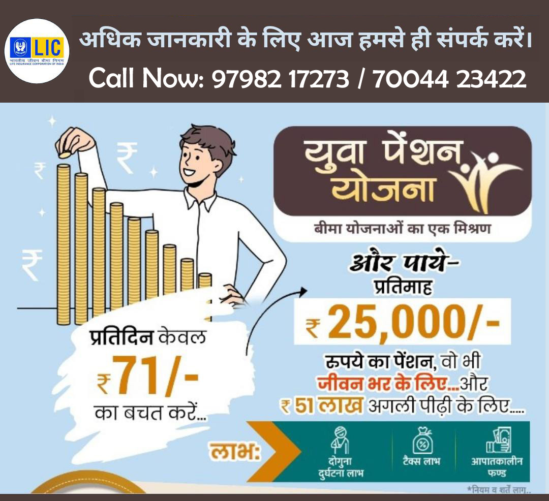 युवा पेंशन योजना। बीमा योजनाओं का एक अद्भुत मिश्रण! प्रतिदिन केवल ₹71/- का बचत करें । और पाएं: प्रति माह ₹25,000/- पेंशन, वो भी जीवन भर के लिए और ₹51 लाख अगली पीढ़ी के लिए । लाभ: दोगुना दुर्घटना लाभ, टैक्स लाभ, आपातकालीन फंड । सुरक्षित भविष्य का वादा!